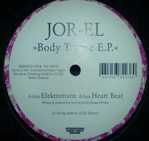 Centre label reads “In loving memory of DJ Hansel.” (p)&(c)2007 International Deejay Gigolo Records & Publishing GmbH & CO KG, Berlin, Germany. Written & produced at Jor-el's House Of Hits.